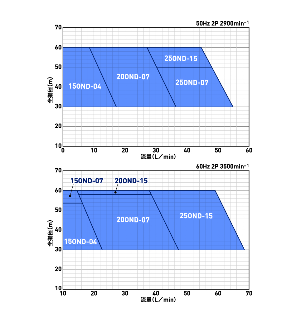 X軸が流量、Y軸が全揚程となります。流量が少ないほど全揚程は高くなり、流量が多いほど全揚程は低くなります。また、モータ軸動力は少流量になるにつれて大きくなりますので使える範囲に限界があります。要求仕様をポインティングし、ご希望の仕様を満たすかご確認ください。