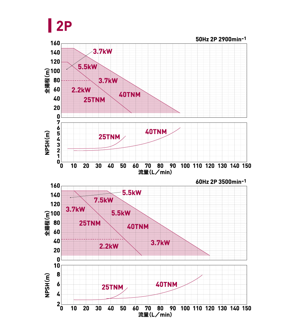 モータ軸動力・ポンプの耐圧・温度上昇の3つの条件により最少流量は決まります。各製品ごとの予想曲線をご参照頂き、詳しくは最寄りの弊社営業所へお問い合わせください。