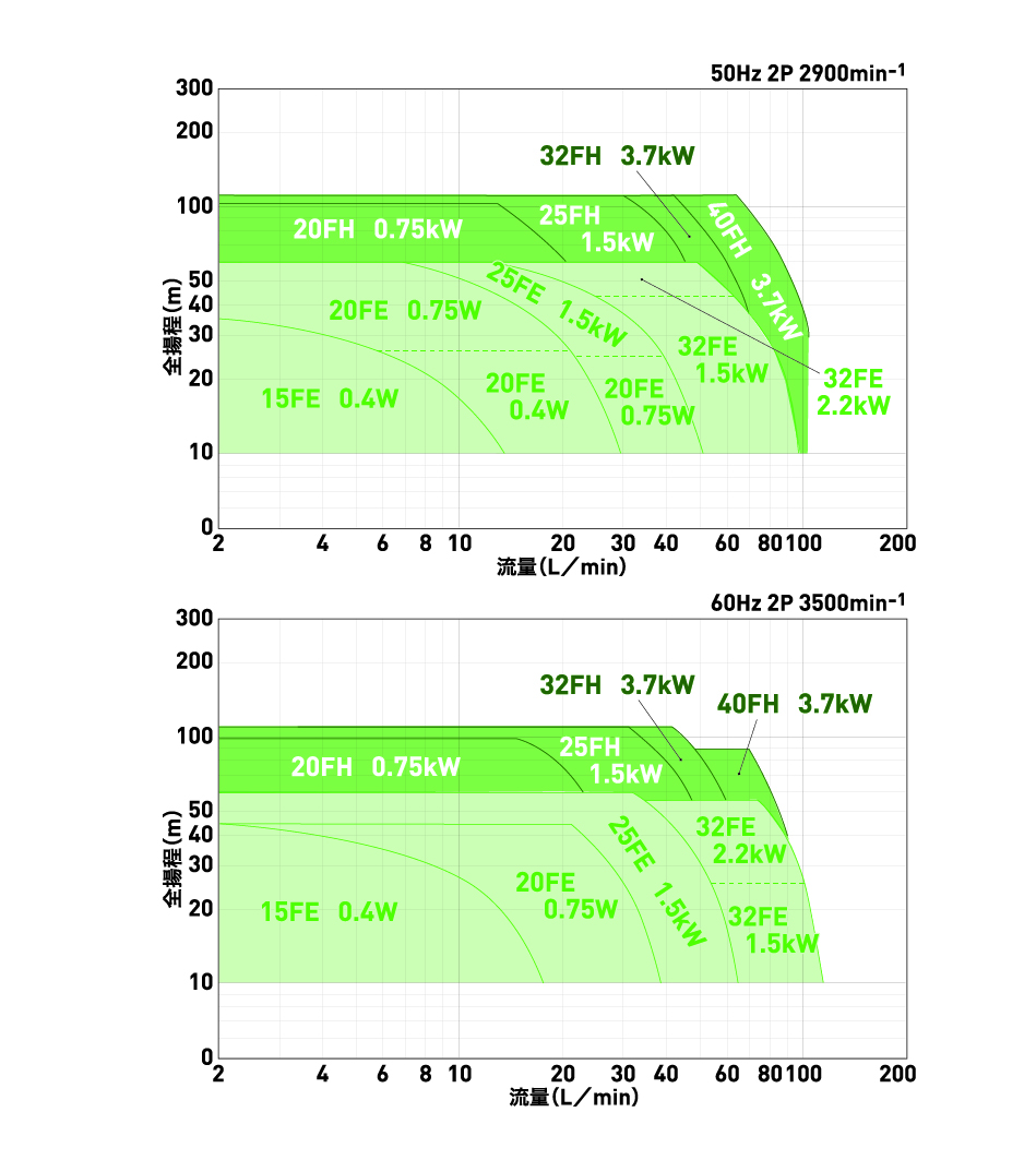モータ軸動力・ポンプの耐圧・温度上昇の3つの条件により最少流量は決まります。各製品ごとの予想曲線をご参照頂き、詳しくは最寄りの弊社営業所へお問い合わせください。