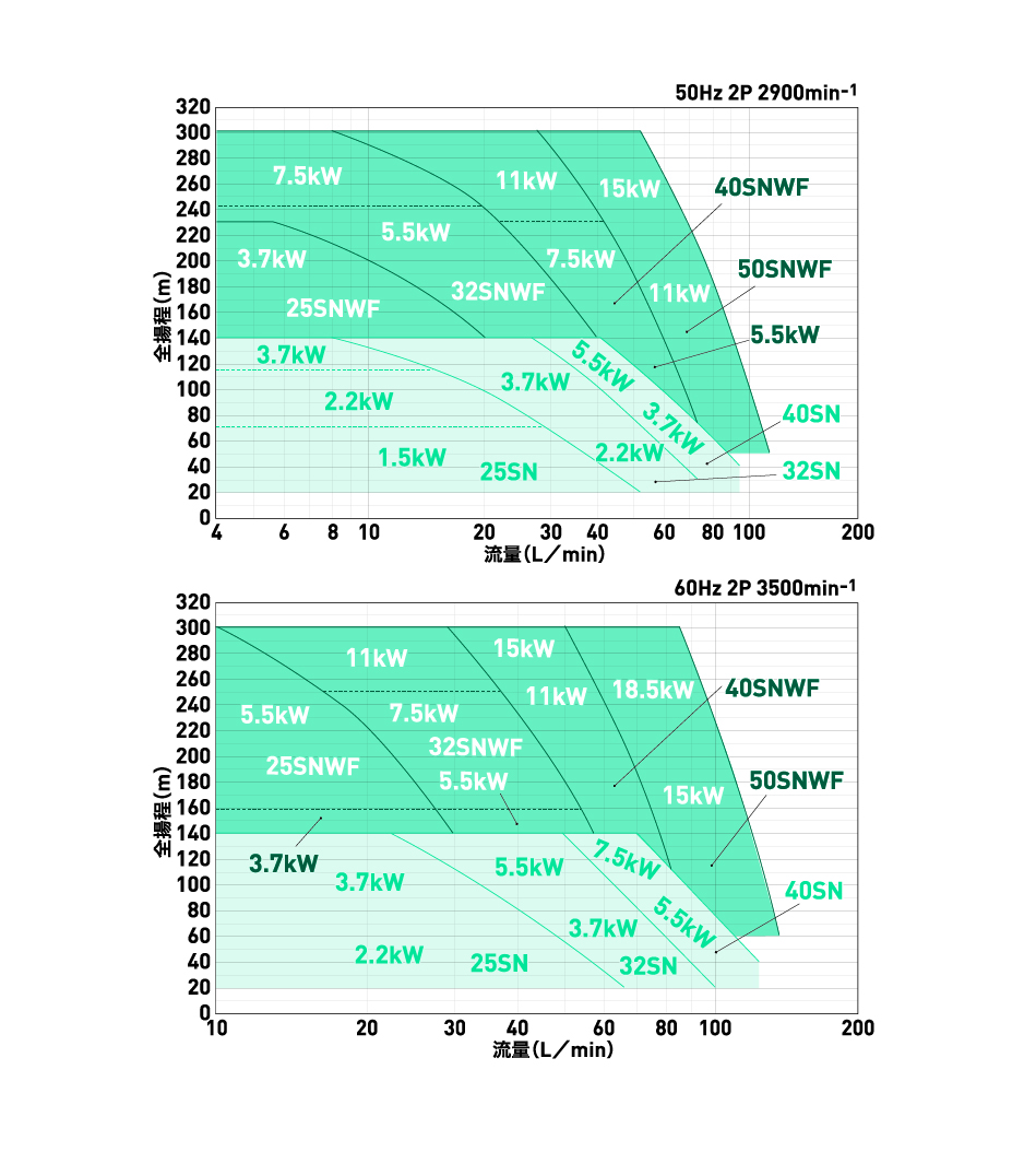 X軸が流量、Y軸が全揚程となります。流量が少ないほど全揚程は高くなり、流量が多いほど全揚程は低くなります。また、モータ軸動力は少流量になるにつれて大きくなりますので使える範囲に限界があります。要求仕様をポインティングし、ご希望の仕様を満たすかご確認ください。