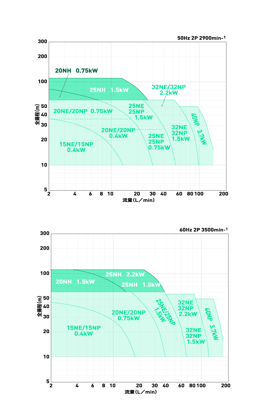 モータ軸動力・ポンプの耐圧・温度上昇の3つの条件により最少流量は決まります。各製品ごとの予想曲線をご参照頂き、詳しくは最寄りの弊社営業所へお問い合わせください。