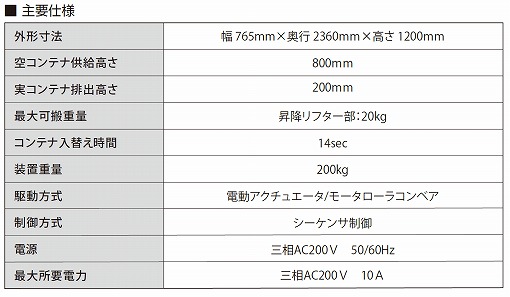 自動機・ストッカ マルチストッカ マルチストッカ MS1500 使いやすさと対応力を追求!! コンテナサイズやユーザーニーズに こたえる 対象の型締力は50~350t 業 界: 自動車・鉄道・航空・船舶 食品・医薬品・化粧品 半導体・液晶 ツール・工具 特長 ●コンテナ・段ボール箱 多種サイズに対応 ガイド調整機構にて対応 ●移動・設置が簡単 エアーレスのため場内移動、設置がスムーズ ●機能 7インチワイドタッチパネル、ピッチダウンなど多彩な機能を装備 ●省スペース 設置スペース内での充実したオプション 標準スペック ■取出機よりダイレクト オプションイメージ ■冷却が必要な場合 ■整列が必要な場合 標準仕様 ■オプション 冷却コンベア(ショット数確認センサ、シュータ) 開閉式バッファ 整列ユニット 箱詰めユニット 検査ユニット 延長ローラコンベア ※その他、多彩なオプションに対応しておりますのでご相談ください 外形図 動画 前のぺージへ戻る お問い合わせ