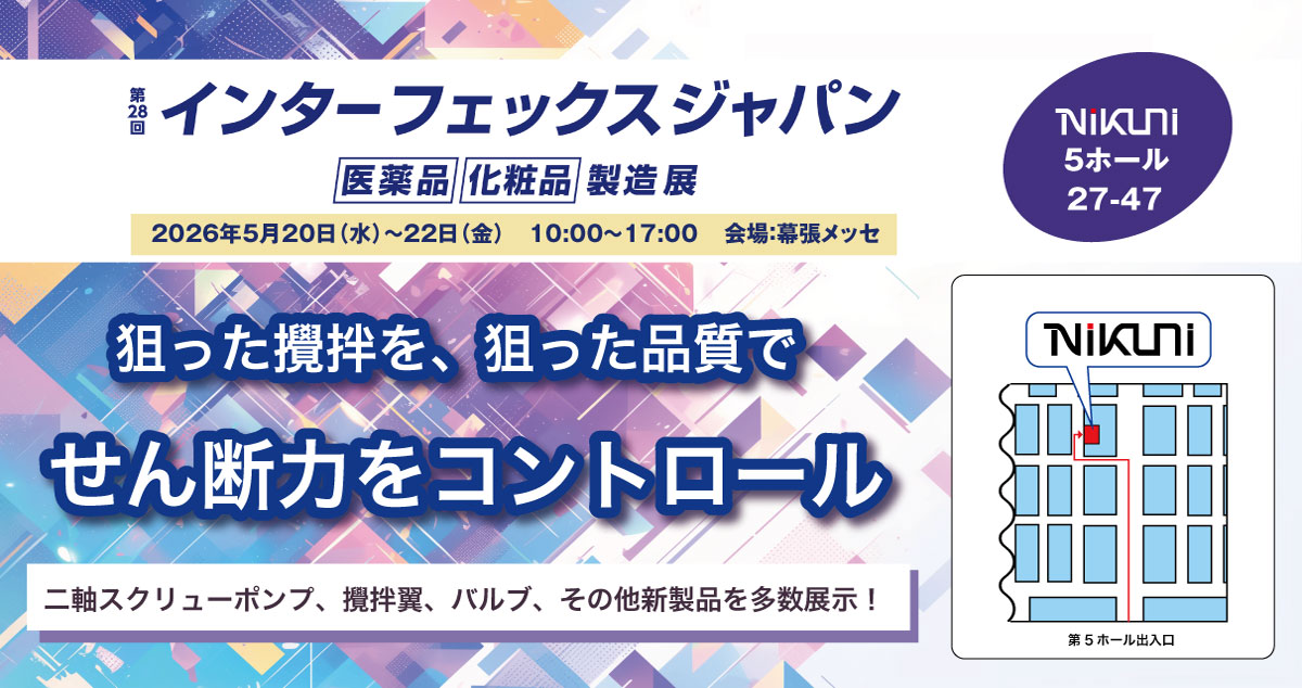 新着情報 2026/02/10BATTERY JAPAN ー国際二次電池展 出展のお知らせ 2026/01/21【WEBセミナーのご案内】混合・攪拌工程向け 「品質安定化・省スペース化」の装置設計術” 低せん断”攪拌翼 "省スペース型"インライン混合 2025/12/082025国際ロボット展 ご来場のお礼 2025/11/25年末年始の休業日について 2025/11/182025国際ロボット展 出展のお知らせ 一覧を見る